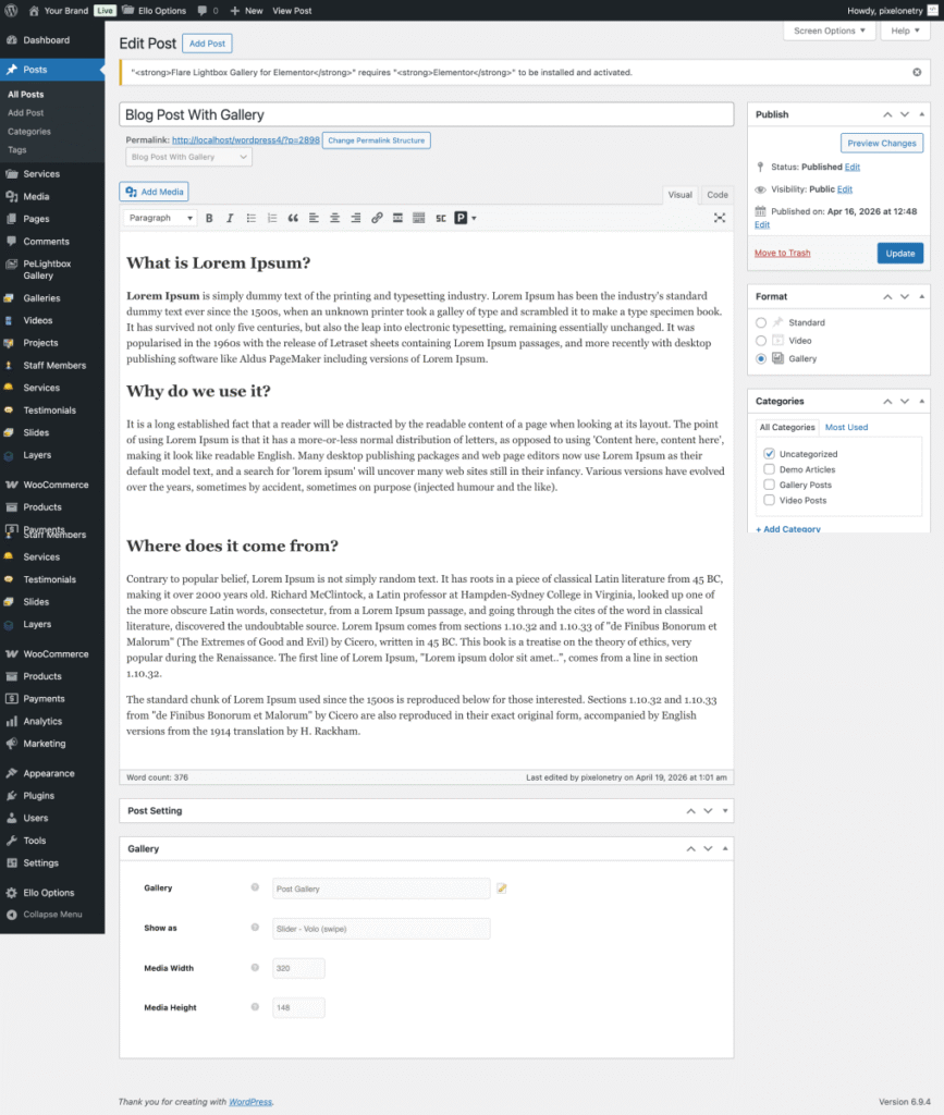 In this guide, you’ll learn how to turn a featured image into a gallery slider step by step using the Ella theme’s built-in gallery and slider system.